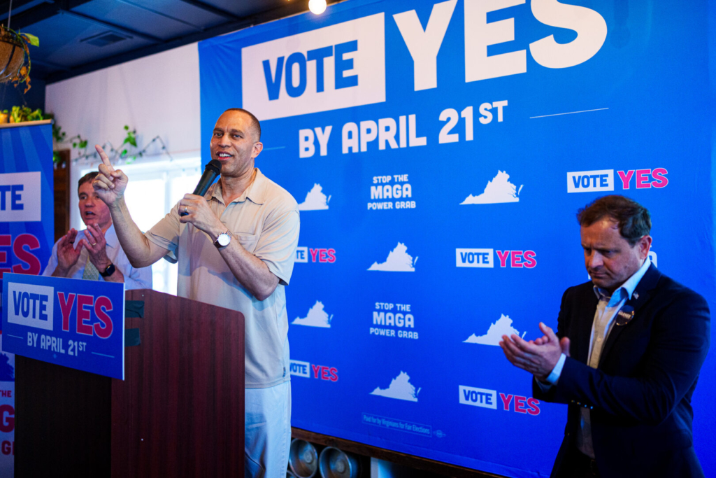 House Minority Leader Hakeem Jeffries, D-N.Y., flanked by Sen. Mark Warner, D-Va., left, and congressional candidate Tom Perriello, D-Va., speaks at the Virginians for Fair Elections rally in Charlottesville, Va., on Saturday. Jeffries urged voters to vote yes on the map refrendum on April 21st. (Bill Clark/CQ Roll Call)