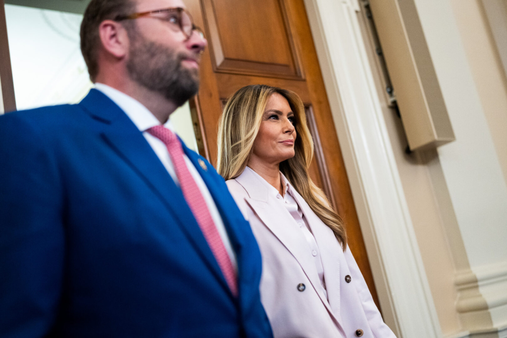 First lady Melania Trump and House Ways and Means Chairman Jason Smith, R-Mo., arrive for a discussion on legislation to protect America’s foster children in the Longworth House Office Building on Wednesday. (Tom Williams/CQ Roll Call)