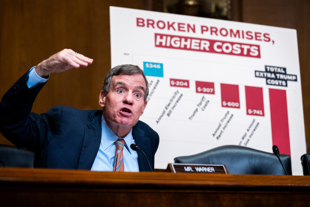 Sen. Mark Warner, D-Va., references higher prices while questioning Internal Revenue Service CEO Frank Bisignano during a Senate Finance Committee hearing on IRS operations on Wednesday. (Tom Williams/CQ Roll Call)