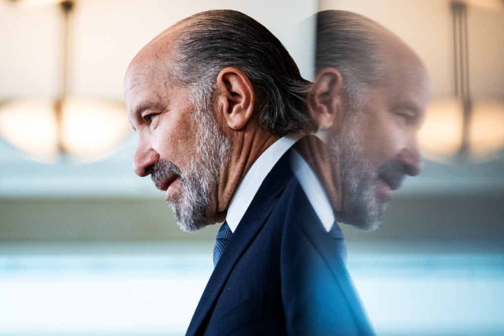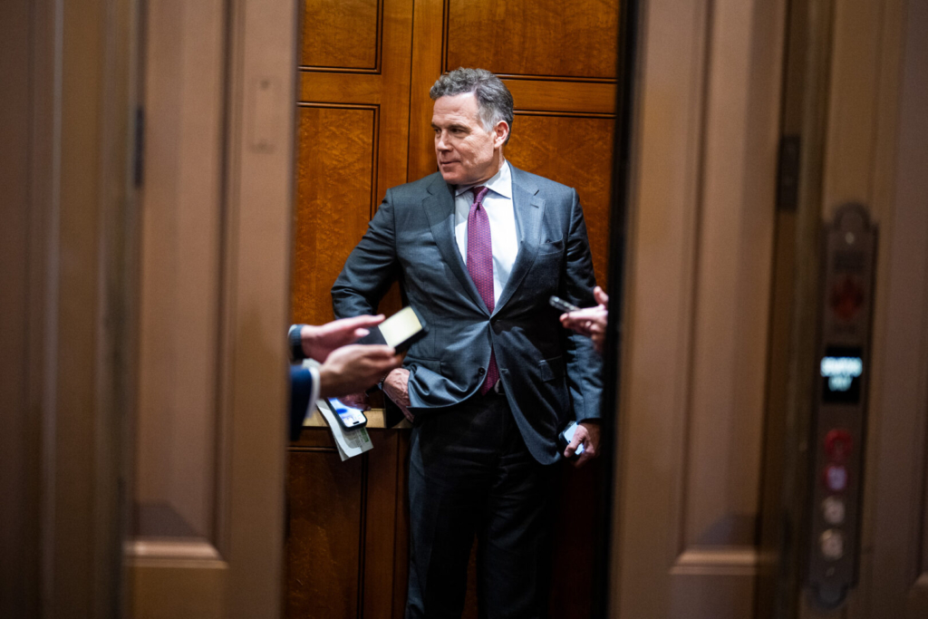 Sen. Dave McCormick, R-Pa., leaves the Senate Republicans’ lunch meeting in the Capitol on Tuesday. (Tom Williams/CQ Roll Call)