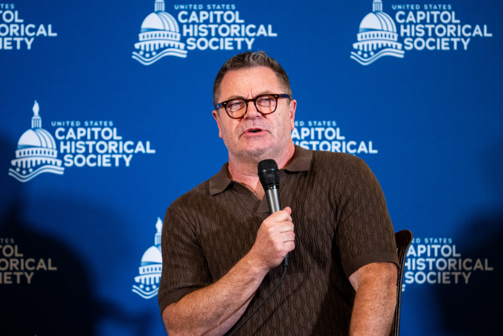 Actor Nick Offerman holds a discussion about historian Candice Millard’s book “Destiny of the Republic” and Offerman’s role in the miniseries “Death by Lightning” in the Capitol on Wednesday. The discussion was held by the U.S. Capitol Historical Society. (Bill Clark/CQ Roll Call)