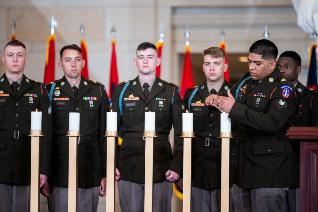 Members of the U.S. Army Honor Guard light candles during the U.S. Holocaust Memorial Museum’s National Commemoration of the Days of Remembrance ceremony in Emancipation Hall on Tuesday. (Tom Williams/CQ Roll Call)