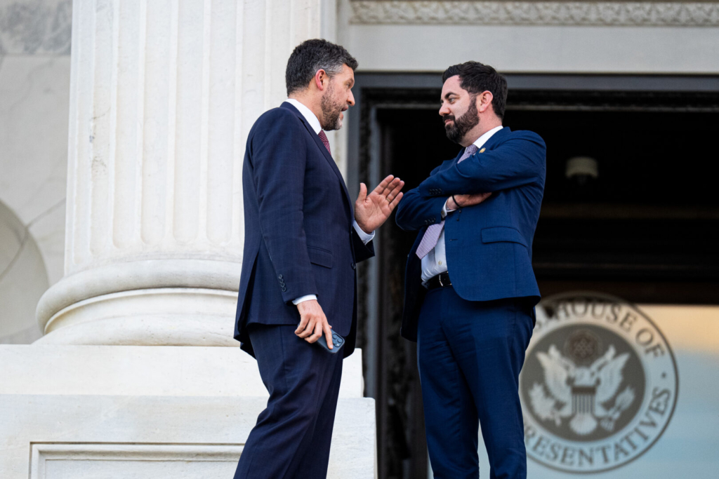 Rep. Pat Ryan, D-N.Y., left, speaks with Rep. Mike Lawler, R-N.Y., on the House steps after a vote on Tuesday. (Bill Clark/CQ Roll Call)